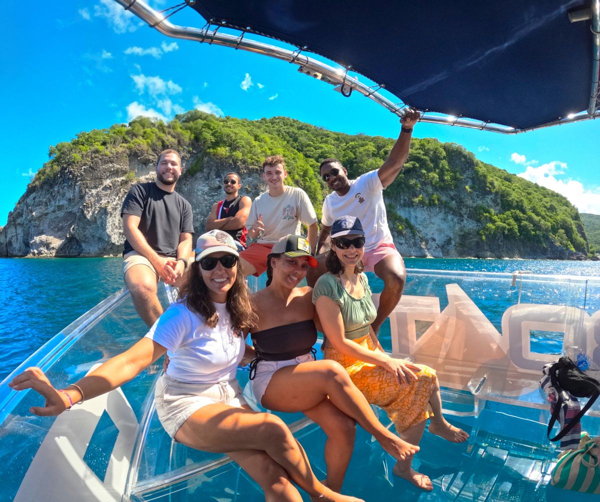 Partez pour 2 heures d’aventure le long des côtes sauvages de Deshaies, à bord de notre bateau unique entièrement transparent 🌊🐠.